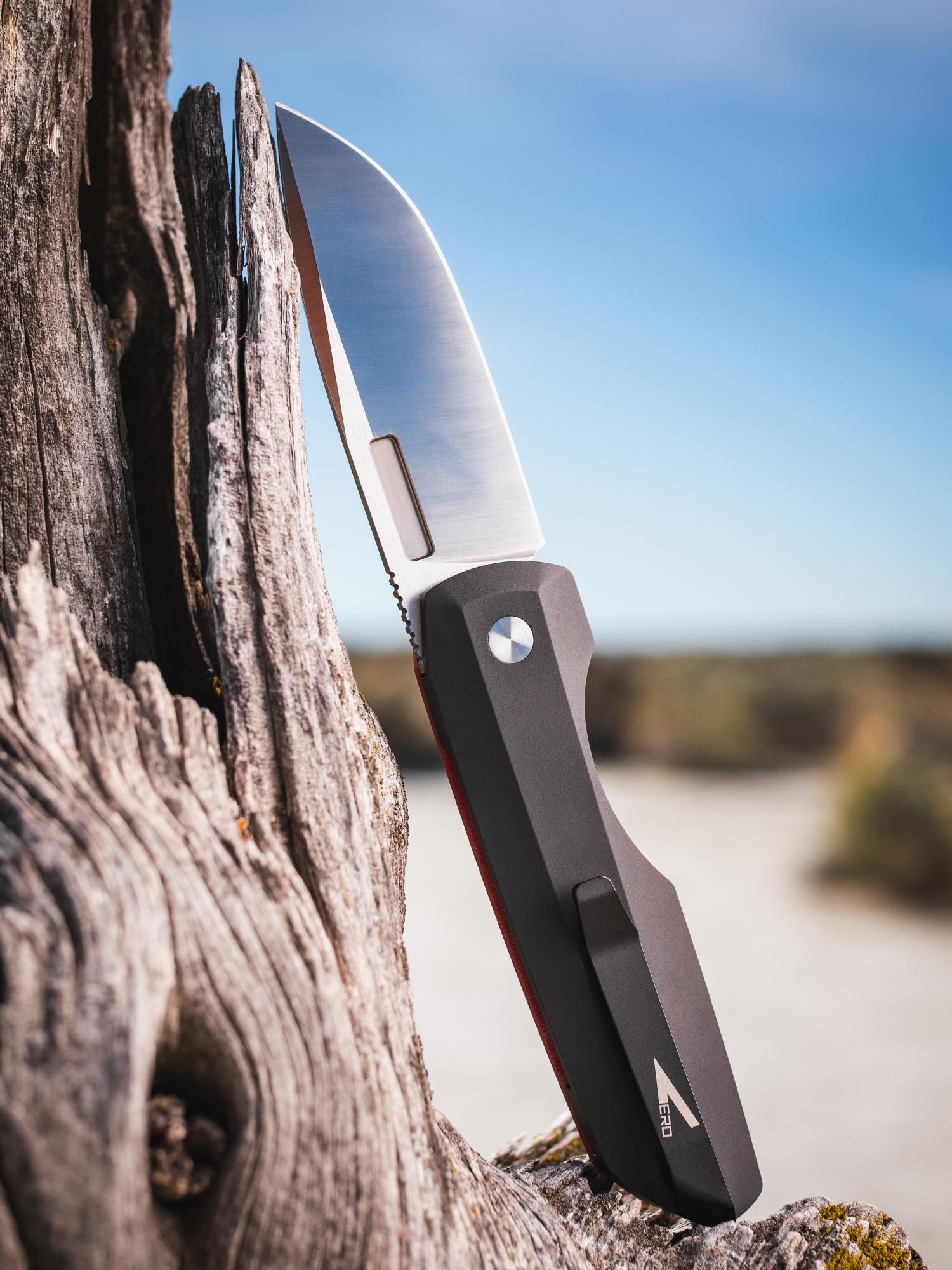 - Black thick back aluminum handle with red linen micarta lid