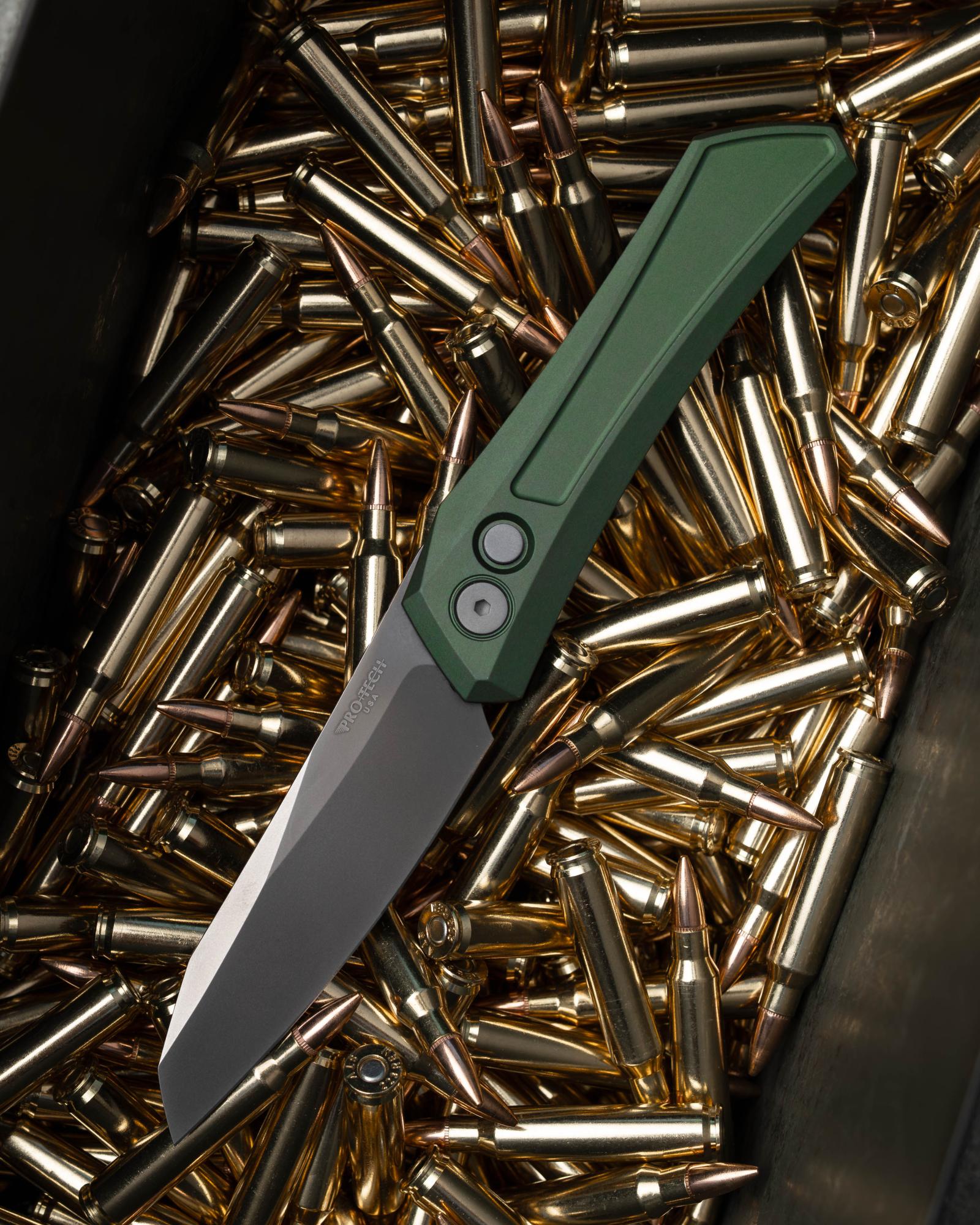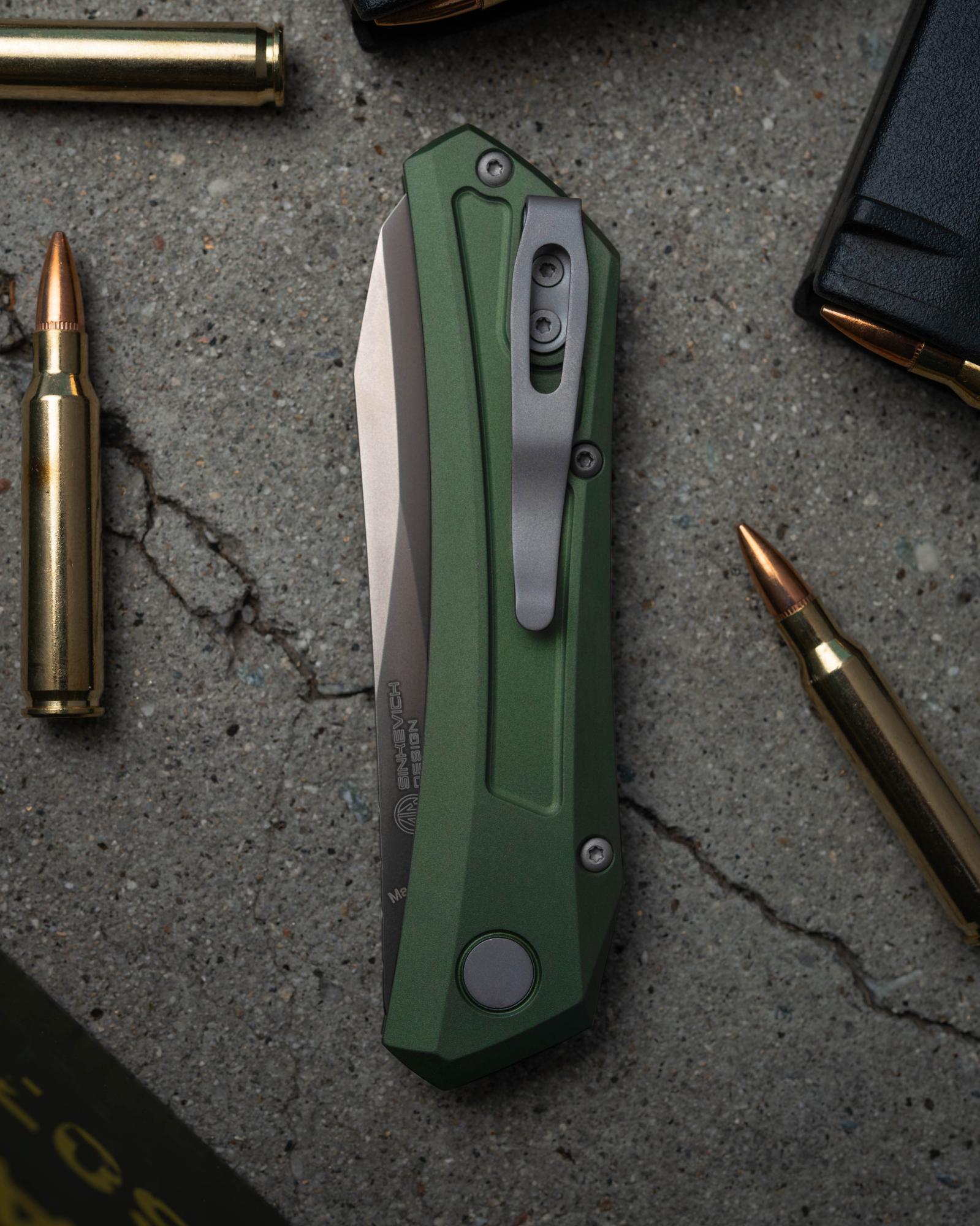 Pro-Tech Dmitry Sinkevich Design Oligarch Automatic knife, Solid green aluminum handle with 3.25 inches Smoky Grey DLC magnacut blade