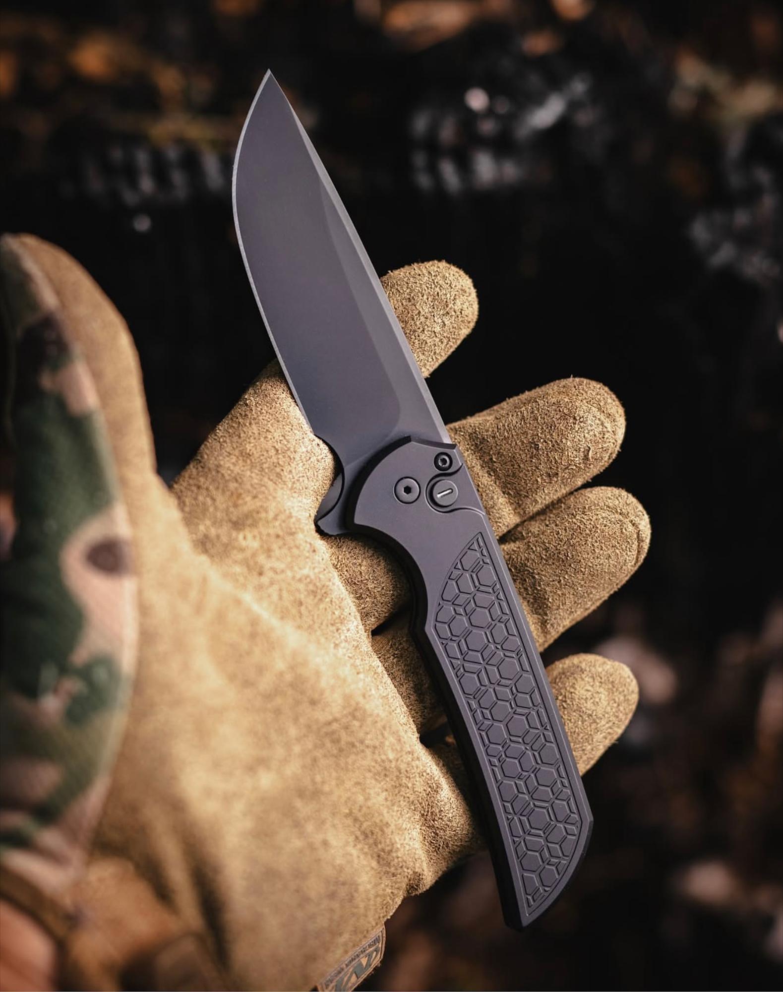 Pro-Tech Mordax Operator Button Lock Knife Black Aluminum Gridlock (3.5 Inches DLC MagnaCut) Blade Show 2025